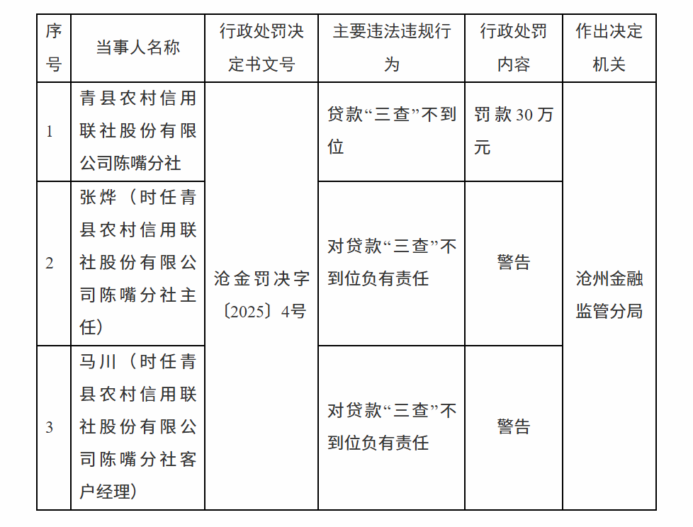 1月6日,国家金融监督管理总局沧州监管分局行政处罚信息公开表显示,青县农村信用联社股份有限公司陈嘴分社因贷款“三查”不到位被罚款30万元。张某、马某被警告。