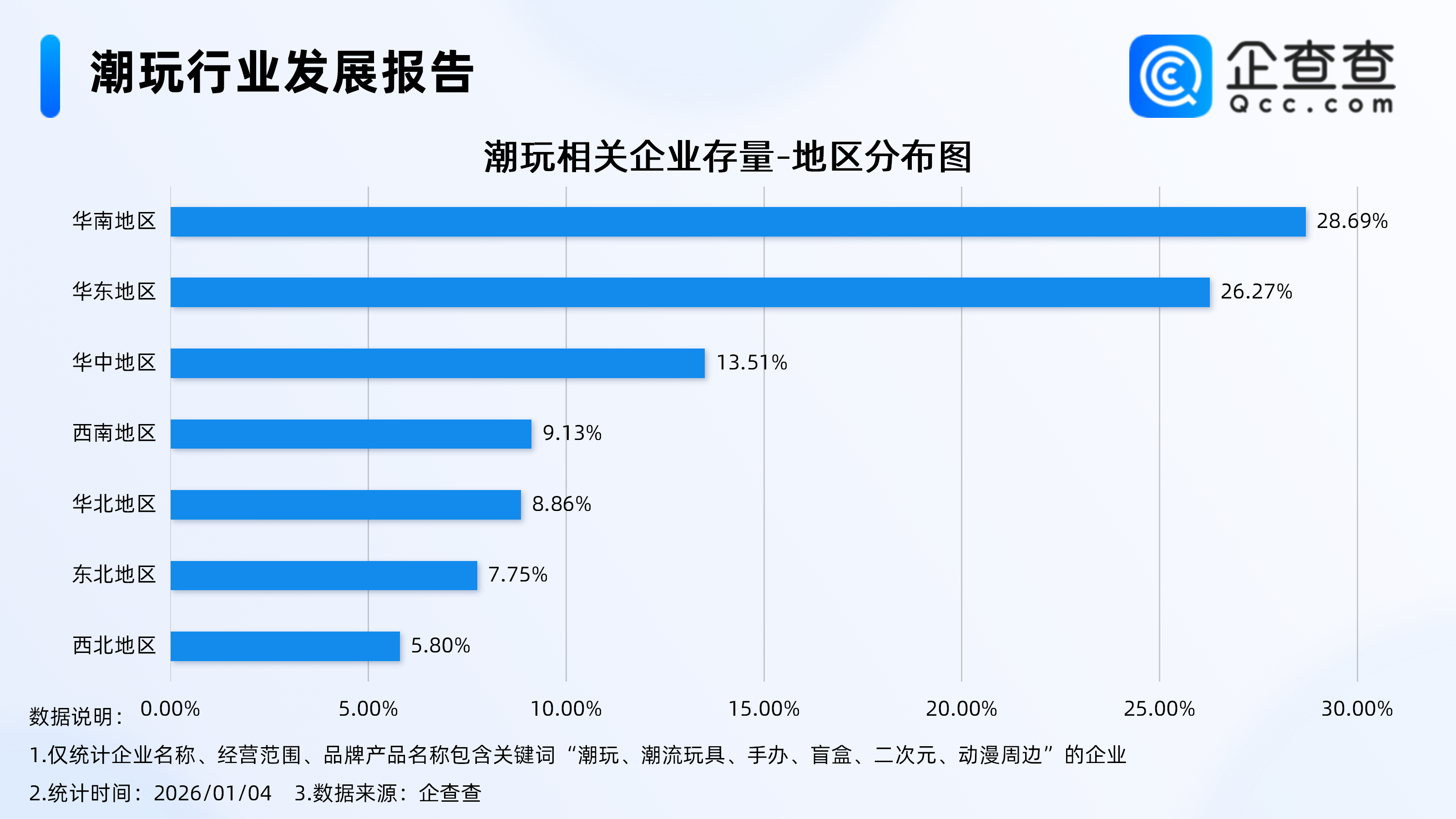 企查查数据显示,从经营时间来看,潮玩相关企业多成立于近三年,其中成立年限在1-3年的相关企业最多,占比43.57%,其次在1年内的相关企业占比36.74%。此外,成立年限在10年以上的相关企业占比2.24%。3.相关企业主要分布在华南、华东地区